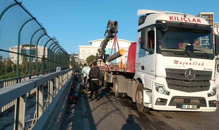 Kaza, Çayırova ilçesi TEM Otoyolu bağlantı kavşağı üst geçidinde meydana geldi. Edinilen bilgiye göre, Mevlüt T. idaresindeki 41 LK 186 plakalı Mercedes marka tır, virajı alamayarak yan yattı. Tırda yüklü olan demir direkler de yola savruldu. Kazayı gören çevredeki vatandaşlar, 112 Acil Çağrı Merkezi’ne haber verdi. İhbar üzerine olay yerine sağlık ve polis sevk edildi. Kısa sürede olay yerine gelen sağlık ekipleri, yaralı sürücüyü ambulansla hastaneye götürdü. Vinç yardımıyla tır ve demirlerin yoldan kaldırılmasıyla trafiğe kapanan yol tekrar açıldı.