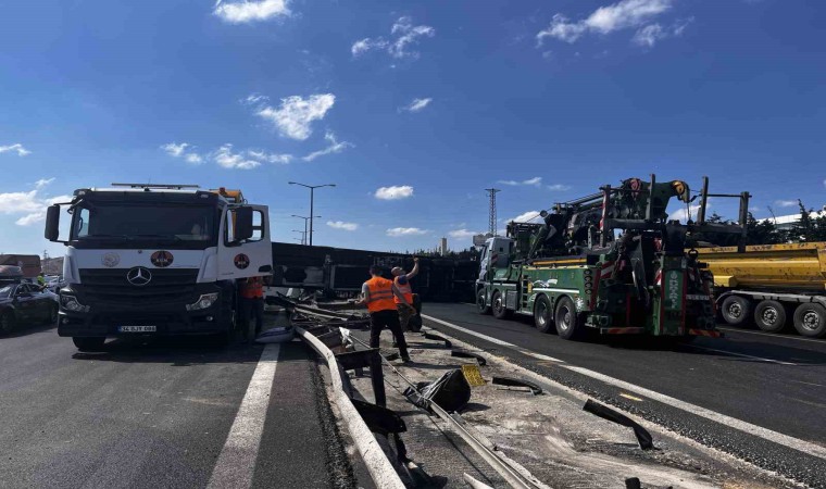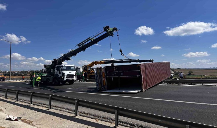 TEM Otoyolu Edirne istikameti Büyükçekmece mevkiinde kontrolden çıkan tır, bariyerlere çarptıktan sonra karşı şeride geçerek devrildi. Kazada tır şoförü ve yanında bulunan bir çocuk yaralandı.