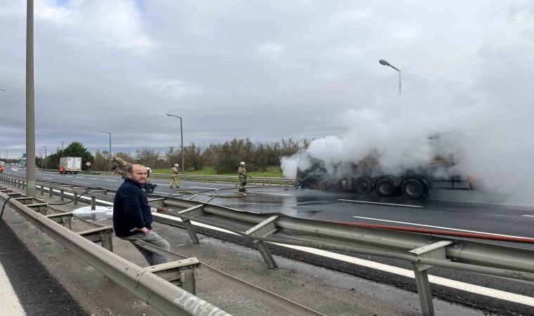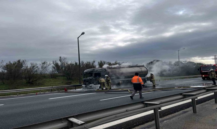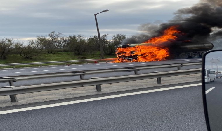Tem Otoyolu’nda seyir halinde olan tutkal yüklü tanker tekeri patlayınca alev alev yandı. Olay’da ölen ya da yaralanan olmadı.