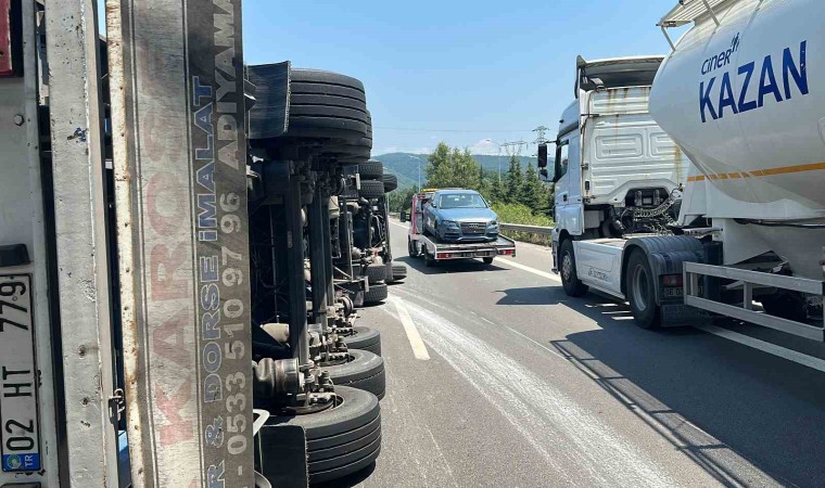 TEM Otoyolu Düzce geçişinde sürücüsünün kontrolünden çıkan tır yan yattı.