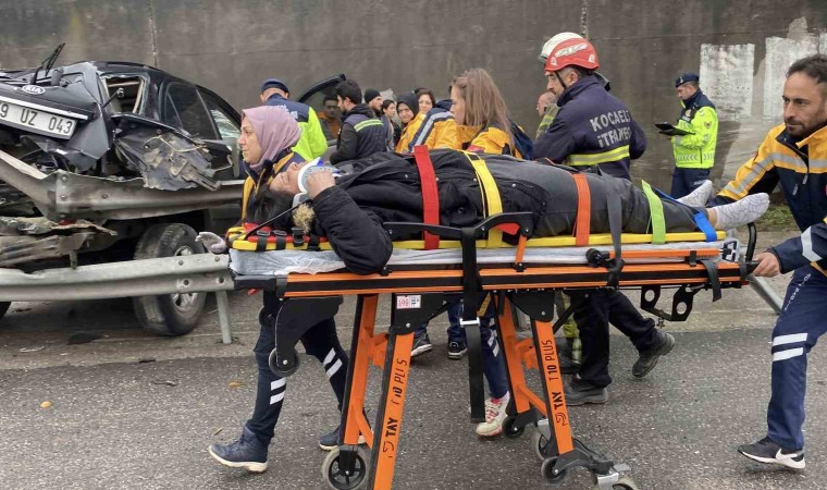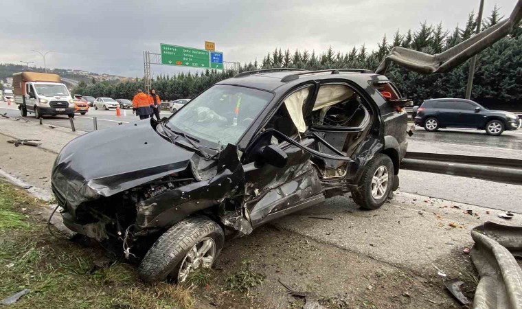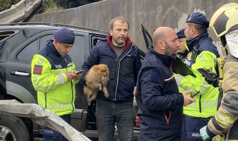 TEM Otoyolu’nun Kocaeli geçişinde bariyere çarpıp yaklaşık 50 metre sürüklenen cip, istinat duvarına çarparak durabildi. 1 kişinin yaralandığı kazada sürücü, köpeğini bir an olsun kucağından bırakmadı.