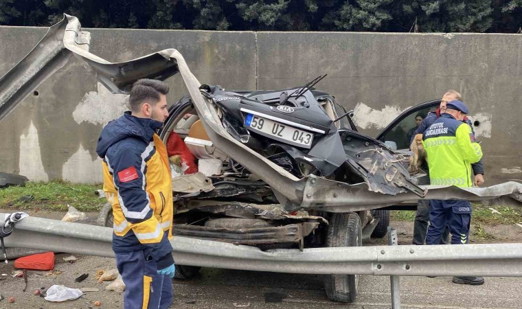 Kaza, TEM Otoyolu İstanbul istikameti Mersincik Mahallesi mevkisinde meydana geldi. H.A. idaresindeki 59 UZ 043 plakalı Kia marka cip, sürücüsünün direksiyon hakimiyetini kaybetmesiyle bariyere çarptı. Bariyeri sökerek yaklaşık 50 metre ilerleyen cip, istinat duvarına çarparak durabildi. Kazada, sürücünün eşi F.A. yaralandı, H.A. ise kazayı hafif sıyrıklarla atlattı. Sürücünün, köpeğini bir an olsun kucağından bırakmadığı görüldü.