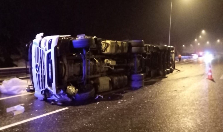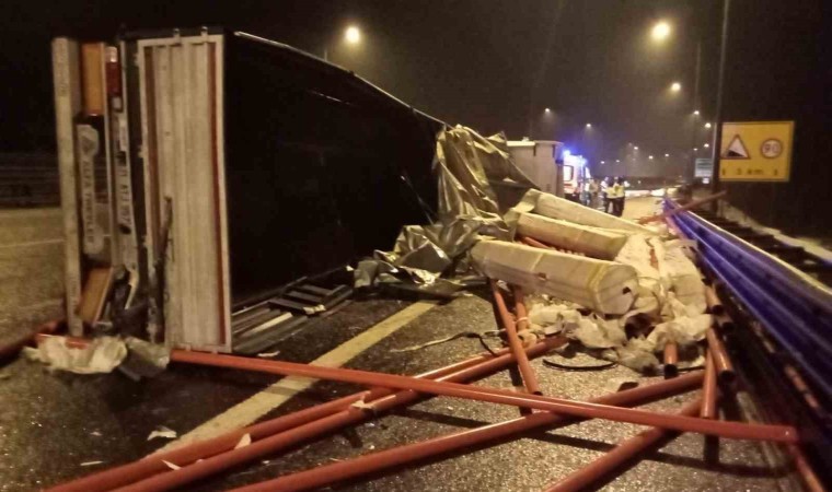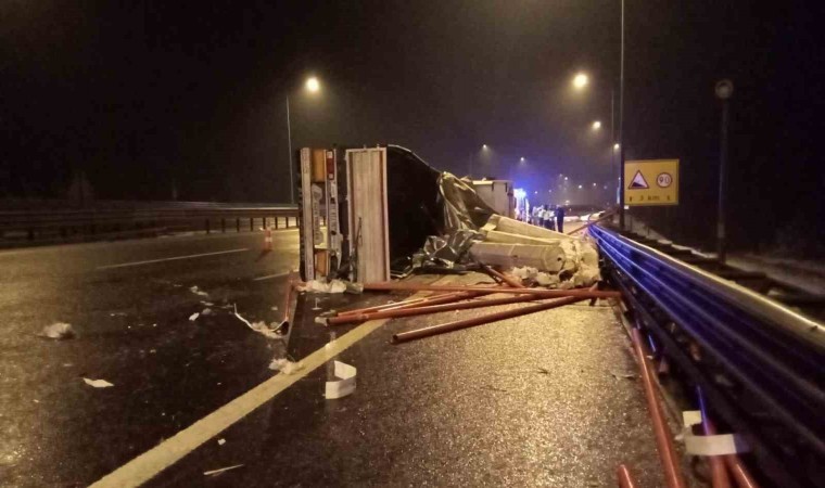 TEM Otoyolu’nun Bolu Dağı Tüneli çıkışında kontrolden çıkan tırın devrilmesi sonucu dorsedeki inşaat malzemeleri yola saçıldı.