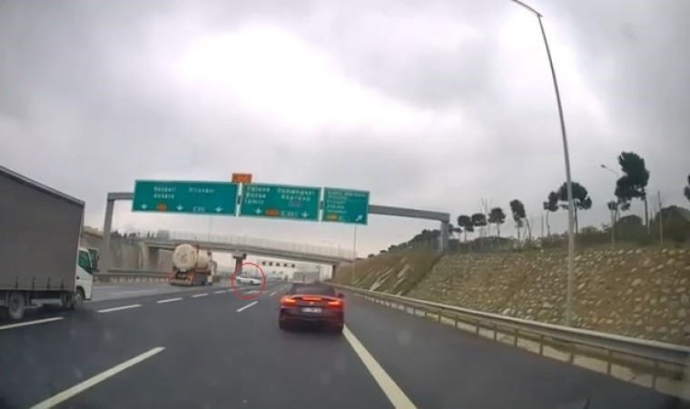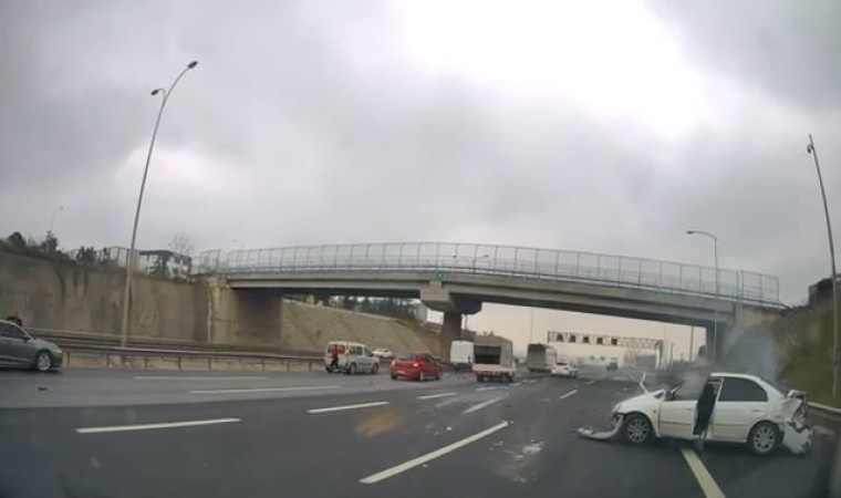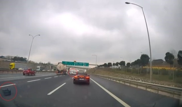 TEM Otoyolu’nun Kocaeli geçişinde yol ortasındaki plastik kasaya çarpmamak için manevra yapan otomobil, önce tıra sonra otomobile çarparak savruldu. O sırada arkadan gelen tır ise savrulan otomobile ve yolcu otobüsüne çarptı. O anlar saniye saniye kameraya yansıdı.