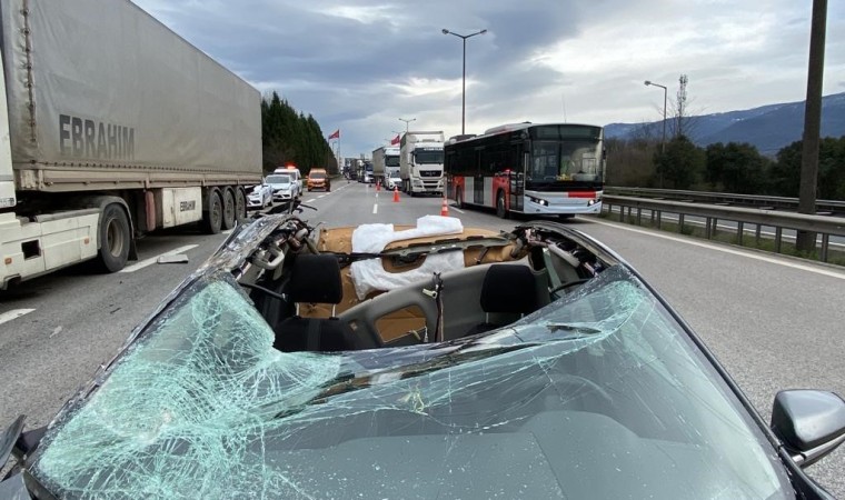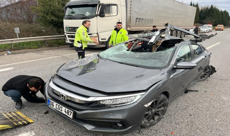TEM Otoyolu Kocaeli geçişinde arıza sebebiyle emniyet şeridinde duran tıra otomobil çarptı. Kazada 3 kişi yaralanırken, çarpışmanın şiddetiyle otomobilin tavanı koptu.