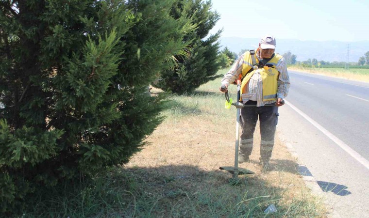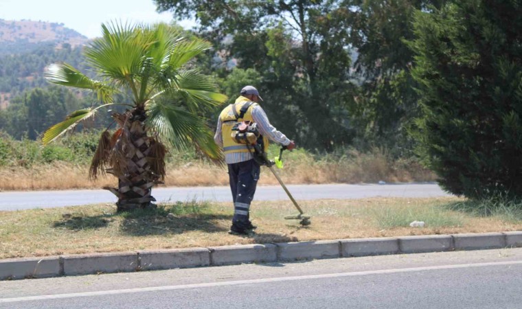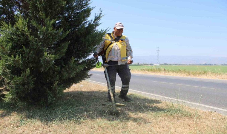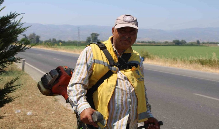 Türkiye’nin en sıcak illerinden olan Aydın’da hava sıcaklıkları 40 derecelerin üzerine çıkarken, Aydın Büyükşehir Belediyesi bünyesinde çalışan temizlik işçilerinin de sıcaklarla mücadelesi başladı. Aydın’ın güzelleşmesi için gece gündüz çalışan belediye ekipleri yol kenarlarındaki kuru otların da temizliğini aralıksız sürdürüyor. Bu çerçevede Aydın-Muğla Karayolu üzerindeki kuru otları temizleyen belediye personellerinden Nuri Arslan da 42 derece güneşin altında ekmek parası için mücadele veriyor. Karayolu üzerindeki kuru otları temizleyerek hem Aydın’ın güzel bir görünüme kavuşmasını hem de sıcaklarla beraber oluşabilecek yangın riskini en aza indirilmesini sağladıklarını ifade eden Arslan; “Yapacak bir şey yok ekmek parası için çalışmak zorundayız. Yaz aylarında Aydın’da en zorlu mesaiyi biz yapıyoruz ama bir yandan da Aydın’ı güzelleştiriyoruz. Başkanımız da bizleri unutmuyor zaten, talimatıyla aşırı sıcak günlerde ekipler gelerek bizlere soğuk su takviyesi yapıyor. Sıcak olsa da hem ekmek parası hem de Aydın için çalışıyoruz” dedi.