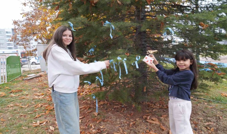 Etkinliğe katılan çocukların yaptıkları resimler ve hazırladıkları notlar diyabet ağacına asıldı