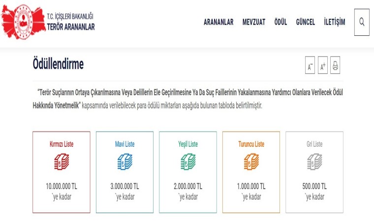 Değişiklikler çerçevesinde; Kırmızı Listede yer alan bir teröristi ihbar etmenin ödülü 10 milyon liradan 20 milyon liraya, Turuncu Liste 1 milyon liradan 8 milyon liraya, Gri Liste 500 bin liradan 2 milyon liraya yükseltildi.