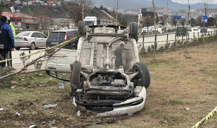 Karabük’te kontrolden çıkıp kaldırıma çarparak yol kenarına devrilen otomobilin sürücüsü kazayı yara almadan atlattı.
