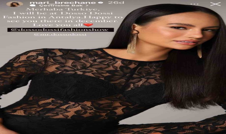 Bu arada, bir gelenek haline gelen güzellerin “Merhaba Türkiye” paylaşımını Brezilyalı model de gerçekleştirdi. Önceki gün sosyal medya hesabında paylaştığı fotoğrafı üzerine “Merhaba Türkiye” yazarak mesajına Türkçe başlayan Maria Brechane, İngilizce devam ederek “Antalya’da Dosso Dossi Fashion Show’da olacağım. Aralık’ta hepinizi göreceğim için mutluyum. Hepinizi seviyorum” dedi. Mesajının sonuna kalp emojisi koyan ünlü manken, Türkiye’ye gelecek olmaktan duyduğu mutluluğu takipçileriyle paylaştı.