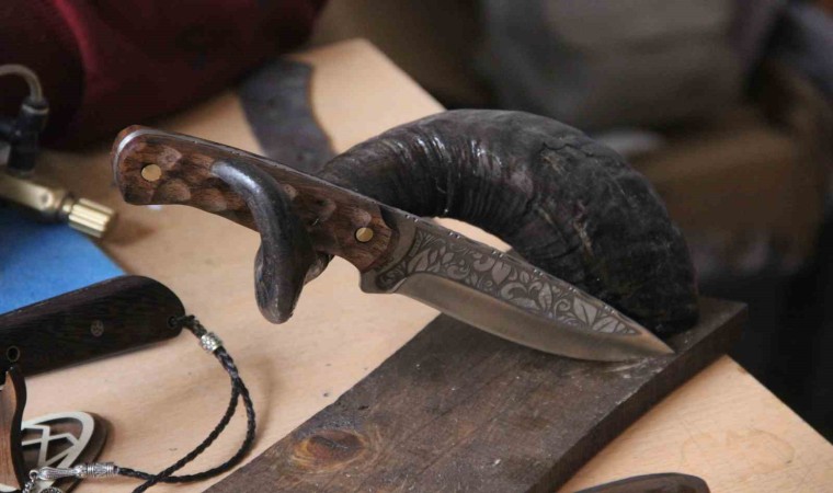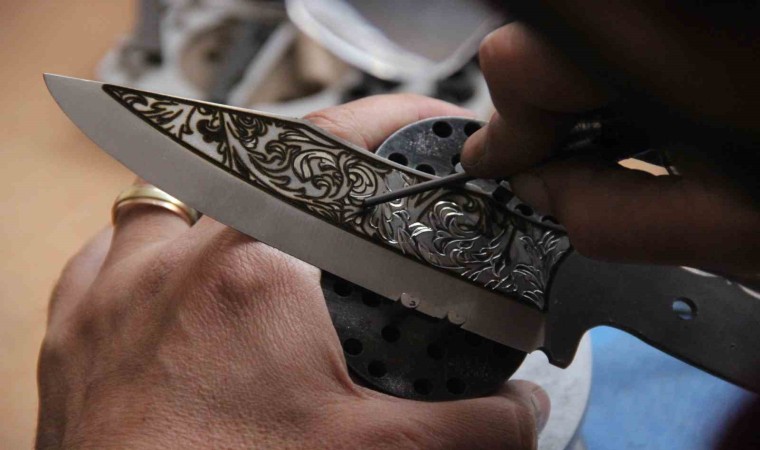 Bıçaklarımızın üzerinde Selçuklu ve Osmanlı motifleri kullandığını ifade eden Göçeri, “Çelikler bize ham olarak geliyor. Biz bıçak görünümü verdikten sonra süsleme işlemine geçiyoruz. Çelik sert bir malzeme olduğu için ısıl işlemden sonra süsleme işlemi yapılmıyor. Daha sonrasında da kabzasını takarak kullanılır hale getiriyoruz. Bu sektör farklı bir sektör. Standartların dışına çıkıyorsunuz. Bu bıçaklara koleksiyonerlerin talepleri yoğun oluyor. Özellikle internet üzerinden ve yurt dışına satışlarımız oluyor. Yurt dışından yoğun bir talep var. Özel talep üzerine istedikleri desen ve şekilde bıçaklar üretiyoruz. Kabzalarımızda da genelde ahşap, koç boynuzu, geyik boynuzu gibi malzemeler kullanıyoruz. Normal bir bıçağın üretim aşaması 4 gün sürebiliyor. İşleme ve gravür girdiği zaman 15-20 günü hatta 1 ayı bulabiliyor. İğne ile kuyu kazmak gibi bir şey” ifadelerine yer verdi.