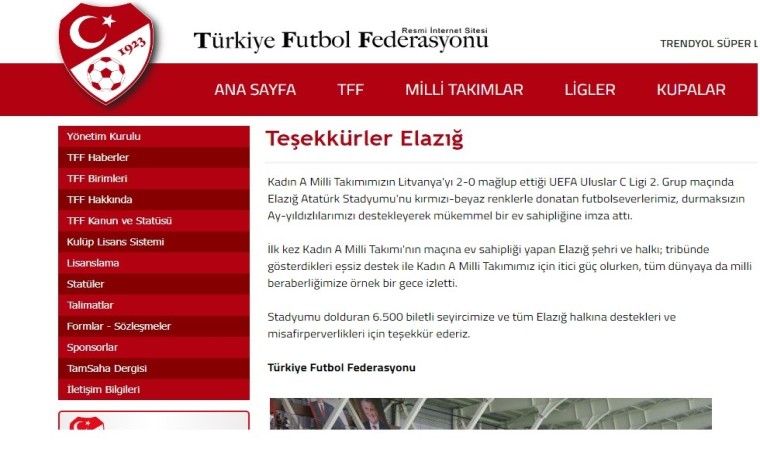 Türkiye Futbol Federasyonu, A Milli Futbol Takımı’nın, Litvanya ile oynadığı UEFA Kadınlar Uluslar C Ligi 2. Grup maçına ev sahipliği yapan Elazığ’a teşekkür etti.