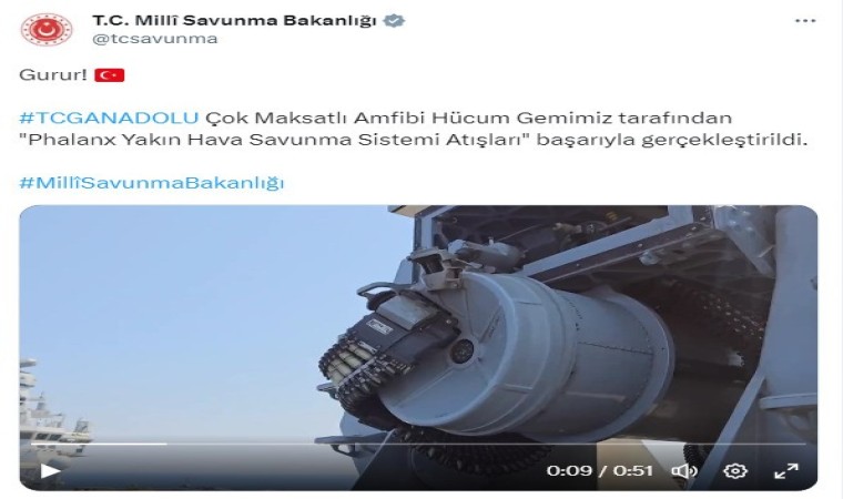 TGC Anadolu’da nefes kesen "Phalanx Yakın Hava Savunma Sistemi Atışları" görüntüleri, Milli Savunma Bakanlığının sosyal medya hesabından paylaşıldı. Paylaşımda, “Gurur! TGC Anadolu çok maksatlı amfibi hücum gemimiz tarafından ‘Phalanx Yakın Hava Savunma Sistemi Atışları’ başarıyla gerçekleştirildi” ifadelerine yer verildi.