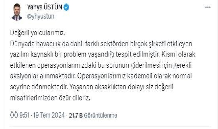 THY Basın Müşaviri Yahya Üstün, konuyla ilgili olarak X üzerinden yaptığı açıklamada, "Bilgi sistemlerinde yaşanan sorunlar nedeniyle biletleme ve rezervasyon işlemlerinde aksamalar yaşanmaktadır. Sorunun giderilmesi ve yolcularımızın mağdur olmaması adına gerekli çalışmalar yapılmaktadır. Söz konusu aksaklık için özür dileriz. En kısa sürede sizlere bilgi vereceğiz. Dünyada havacılık da dahil farklı sektörden birçok şirketi etkileyen yazılım kaynaklı bir problem yaşandığı tespit edilmiştir. Kısmi olarak etkilenen operasyonlarımızdaki bu sorunun giderilmesi için gerekli aksiyonlar alınmaktadır. Operasyonlarımız kademeli olarak normal seyrine dönmektedir. Yaşanan aksaklıktan dolayı siz değerli misafirlerimizden özür dileriz" ifadelerine yer verdi.