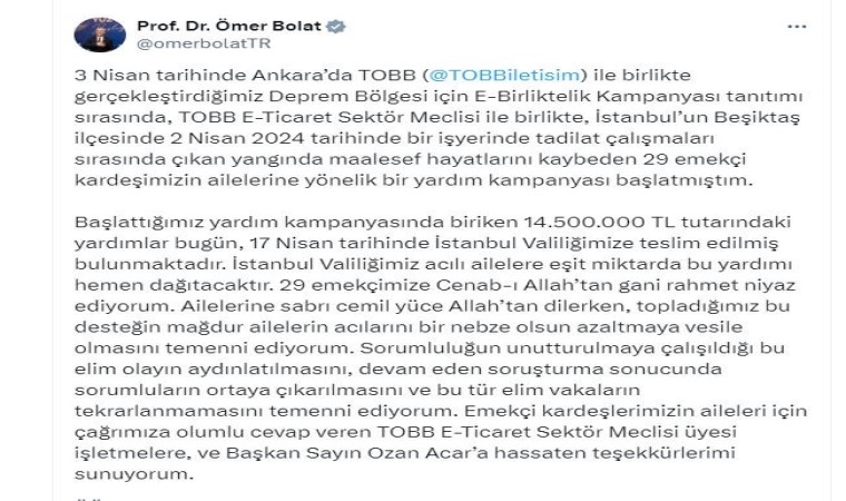Ticaret Bakanı Ömer Bolat, sosyal medya hesabından yaptığı açıklamada, 2 Nisan’da Beşiktaş’ta bir işyerinde tadilat çalışmaları sırasında çıkan yangında 29 işçinin hayatını kaybettiğini, 3 Nisan’da Ankara’da TOBB ile birlikte gerçekleştirilen Deprem Bölgesi için E-Birliktelik Kampanyası tanıtımı sırasında, TOBB E-Ticaret Sektör Meclisi ile birlikte, işçilerin ailelerine yönelik bir yardım kampanyası başlattıklarını söyledi.