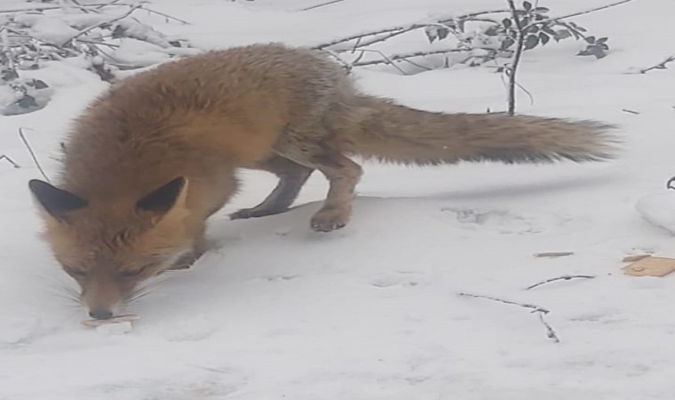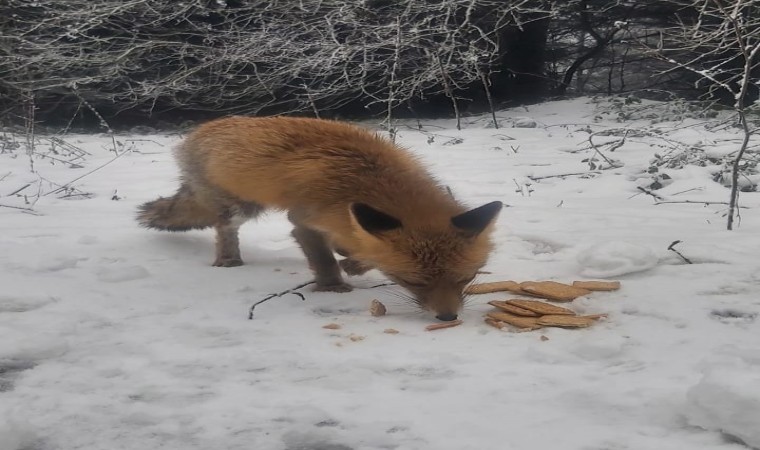 Bolu’da orman yolunda tilkiyle karşılaşan vatandaşlar, yanlarında bulunan bisküvi ile tilkiyi besledi.