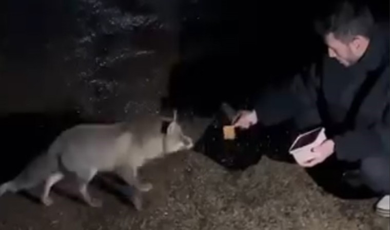 Bolu’da gece saatlerinde Gölköy Barajı Gölü’nün etrafında yiyecek arayan tilkiyi gören vatandaş, börekle tilkiyi besledi.