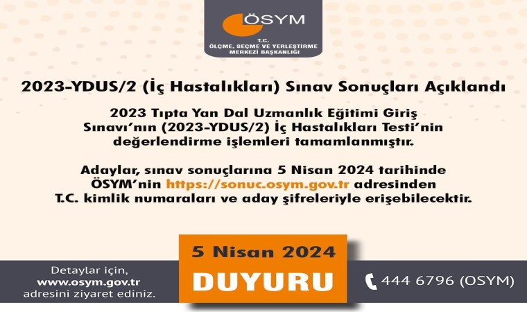 Ölçme, Seçme ve Yerleştirme Merkezi (ÖSYM) Başkanlığı, 2023 Tıpta Yan Dal Uzmanlık Eğitimi Giriş Sınavı’nın (2023-YDUS/2) İç Hastalıkları Testi sonuçlarının açıklandığını bildirdi.