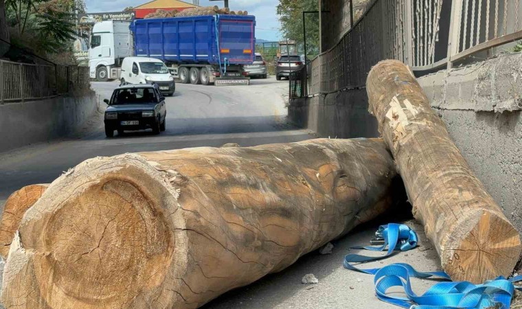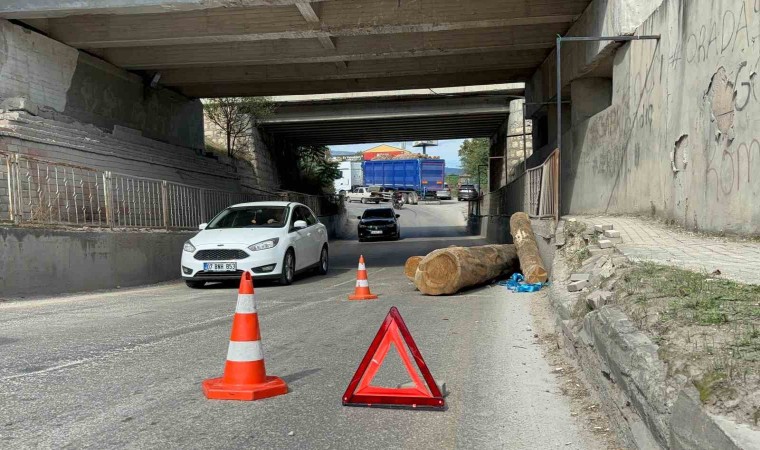 Bolu’da 4.10 metre yükseklik kapasitesi olan alt geçitten geçmek isteyen tır, yüklü tomrukları yola düşürdü. Tır sürücüsüne "yük düşürmek" suçundan cezai işlem uyguladı.