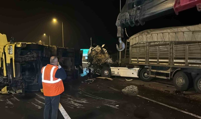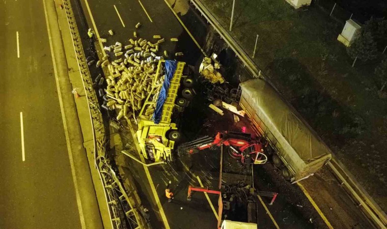 Anadolu Otoyolu Düzce geçişinde tır ile kamyon çarpıştı. Otoyolun İstanbul istikameti trafiğe kapanırken, yolu açma çalışmaları havadan dron ile görüntülendi.