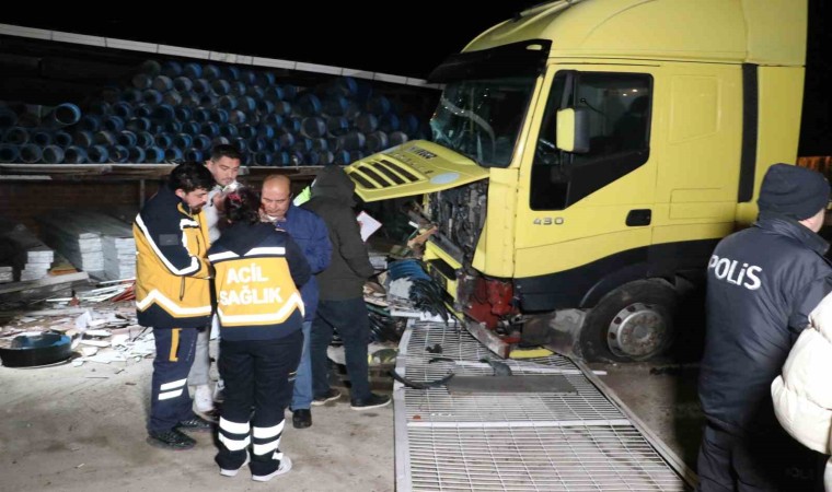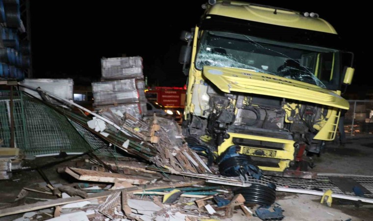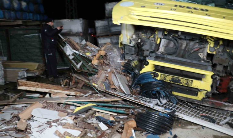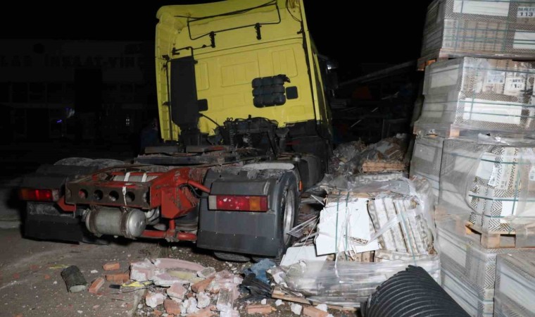 Amasya’nın Taşova ilçesinde inşaat malzemeleri satılan bir iş yerine dalan tır kameraya yansıdı. Kazada, iş yerinin önünde satışa sunulan ürünler, palet üzerinde yüklü fayanslar ve inşaat malzemeleri çevreye saçıldı.