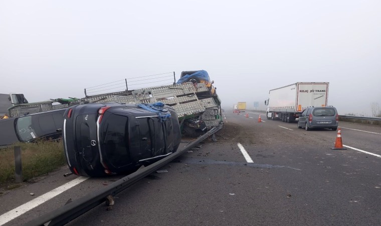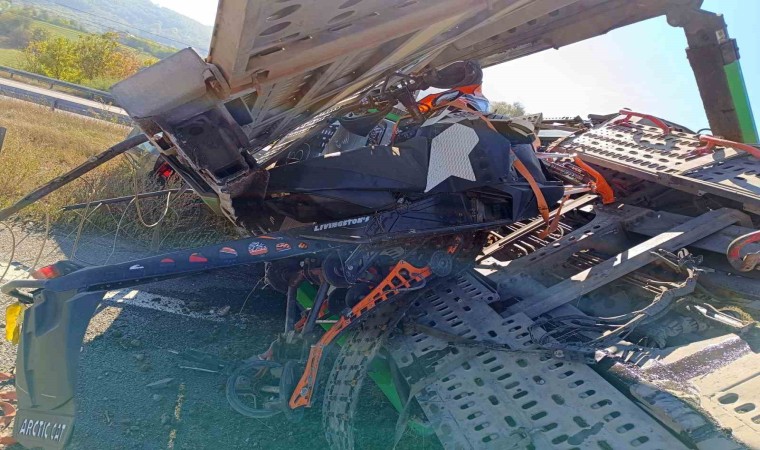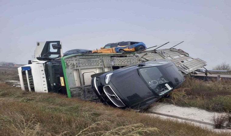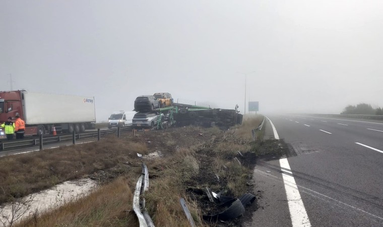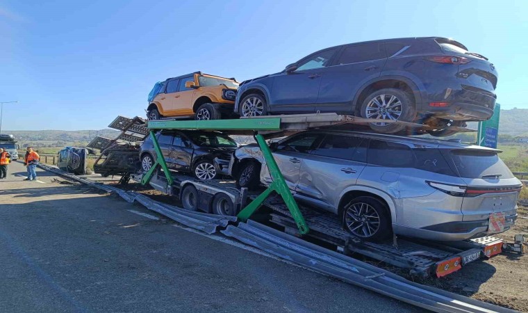 TEM Otoyolu’nun Bolu geçişinde 8 adet lüks aracı taşıyan tır, kontrolden çıkarak devrildi. Tırın dorsesindeki lüks araçlar hurdaya döndü.