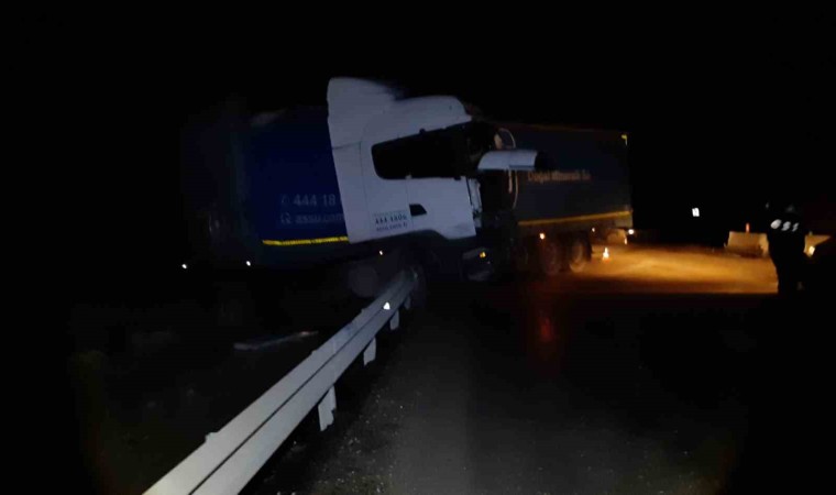 Bolu’nun Mudurnu ilçesinde kontrolden çıkan tır makaslayarak bariyerlere çarptı, kazada sürücü yaralandı.
