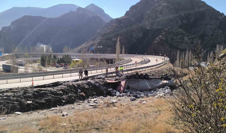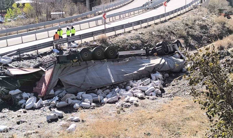 Azerbaycan plakalı tırın sürücüsünün kimliği ve yaşı henüz belirlenemedi. Kazada tır, şarampole yuvarlanarak ters döndü ve içerisindeki yük çevreye yayıldı.