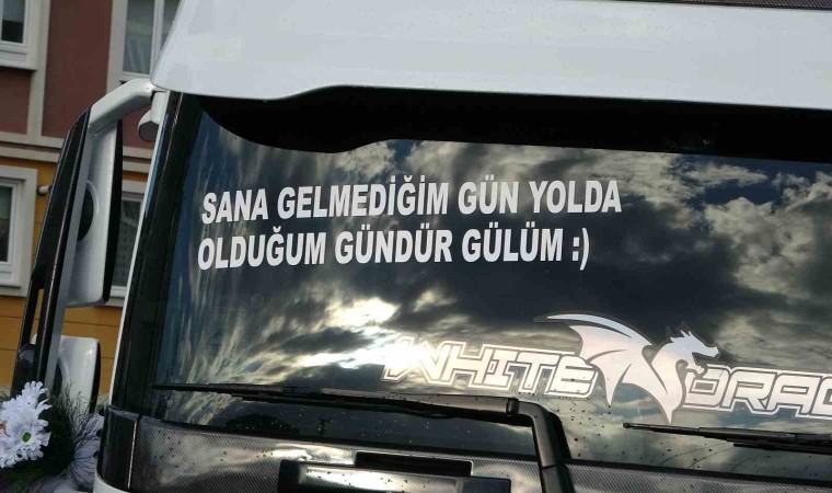 Öte yandan, çiftin gelin tırı için aracın camına yazdırdığı "Sana gelmediğim gün yolda olduğum gündür gülüm" yazısı ise dikkat çekti.
