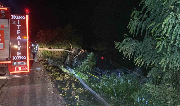 Kaza Anadolu Otoyolu Düzce geçişinde meydana geldi. Edinilen bilgilere göre Karabük’ten yüklediği sac boruları İstanbul’a götüren Cüneyt Savur idaresindeki 06 DDV 228 plakalı tır, sürücüsünün direksiyon hakimiyetini kaybetmesi sonucu yol kenarına uçarak takla attı. Emniyet kemeri takılı olan sürücünün kazadan burnu bile kanamadan çıkması dikkat çekti. Emniyet kemerinin hayatını kurtardığını belirten Cüneyt Savur, “Karabük’ten sac boru yüklemiştim. İstanbul Tuzla’ya gidiyordum. Direksiyon hakimiyetimi kaybettim. Şarampole yuvarlanıp takla attım. Emniyet kemerimin takılı olmasından dolayı çok şükür bu kazadan yara almadan kurtuldum. Emniyet kemeri hayat kurtarır, diyorlar. Evet doğru” şeklinde konuştu.