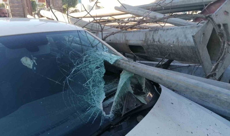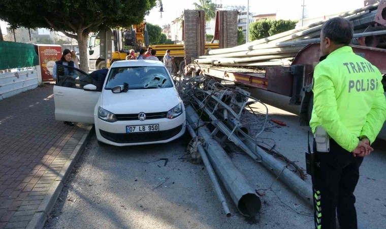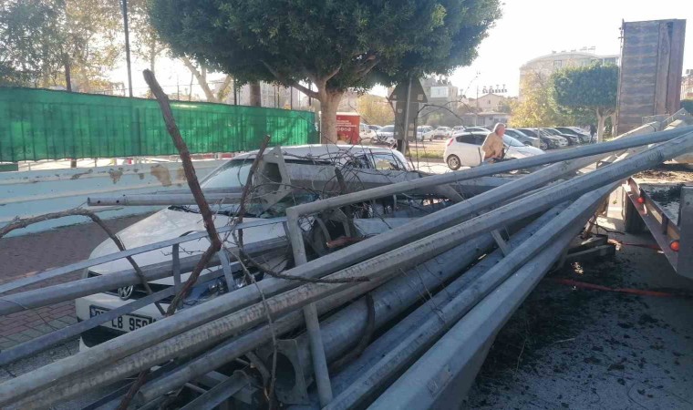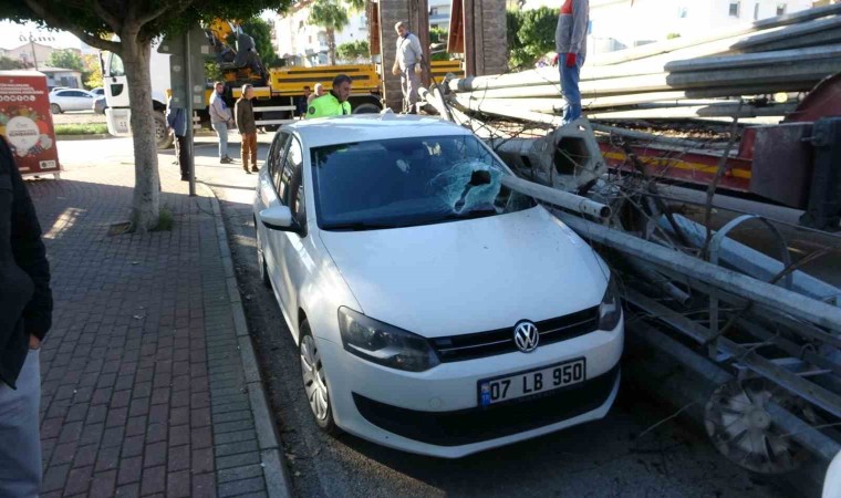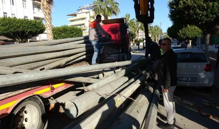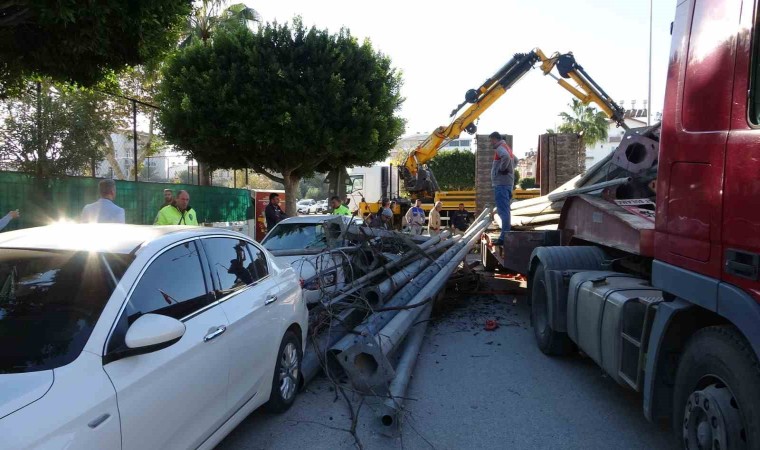 Antalya’nın Manavgat ilçesinde dönmekte olan tırın üzerindeki demir direkleri, halatın kopmasıyla yola devrildi. Direkler yol kenarında park halinde bulunan 2 otomobile zarar verdi. Aracı zarar gören bir kişi, “Muhatabım kim onu öğrenmek istiyorum” diyerek tepki gösterdi.