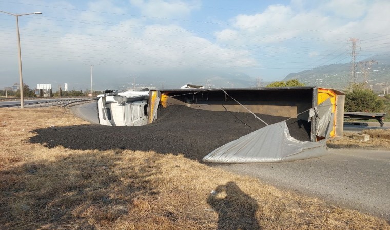 Hatay’da sürücüsünün virajı alamadığı kömür yüklü tır devrildi, kazada sürücü yaralandı.