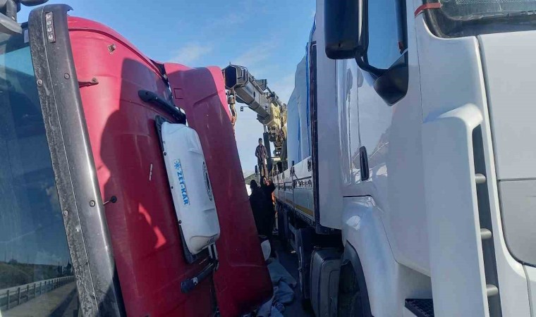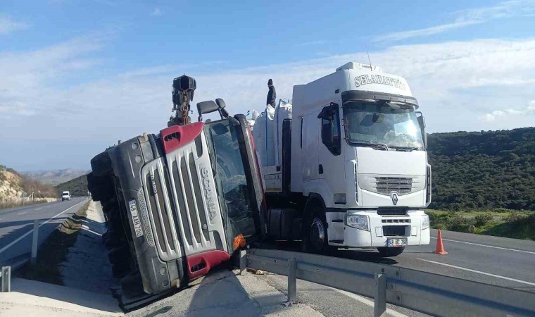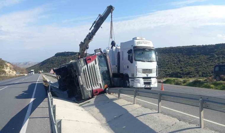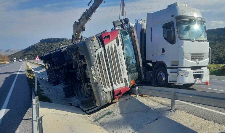 Aydın’da karayolunda balık unu yüklü tır çift şeritli yolun ortasına devrilirken kazada şans eseri yaralanan olmadı.