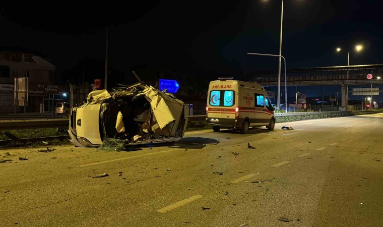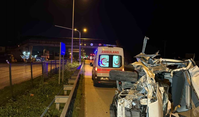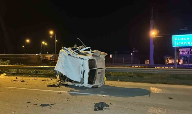 Düzce’de hafif ticari araç tıra arkadan çarpıp savruldu. Bariyerlere çarpıp devrilen araçta 1 kişi öldü, 1 kişi ise yaralandı.