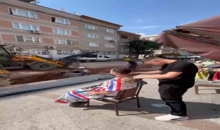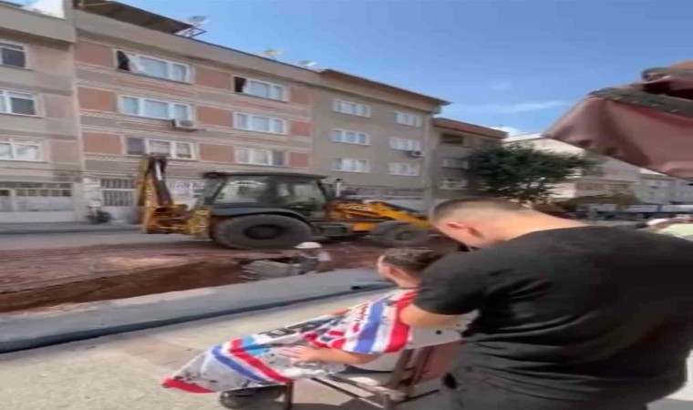 Bursa’da berberini ikna eden vatandaş, kaldırım üzerinde tıraş olurken yol yapım çalışmasını izledi.