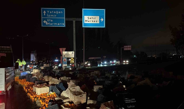 Olay, Menteşe İlçesinde bulunan bölge kavşağında akşam saatlerinde meydana geldi. Edinilen bilgiye göre narenciye sevkiyatı yapan tır sürücüsü, kavşaktan sert şekilde dönüş yapmaya çalıştı. Bu sırada tırın yan kapağı, portakal dolu kasaların ağırlığına dayanamadı ve tonlarca narenciye yola saçıldı. 112 Acil Çağrı Merkezi’ne yapılan ihbar sonrası bölgeye trafik ekipleri sevk edildi. Ekipler, yolu trafiğe kapattı. Ardından bölgeye gelen Menteşe Belediyesi’ne bağlı temizlik ekipleri yolu temizlerken, yol uzun süre sonra trafiğe tekrar açıldı. Yaşanan olay sırasında kavşakta başka bir aracın olmaması muhtemel bir başka kazayı önledi.