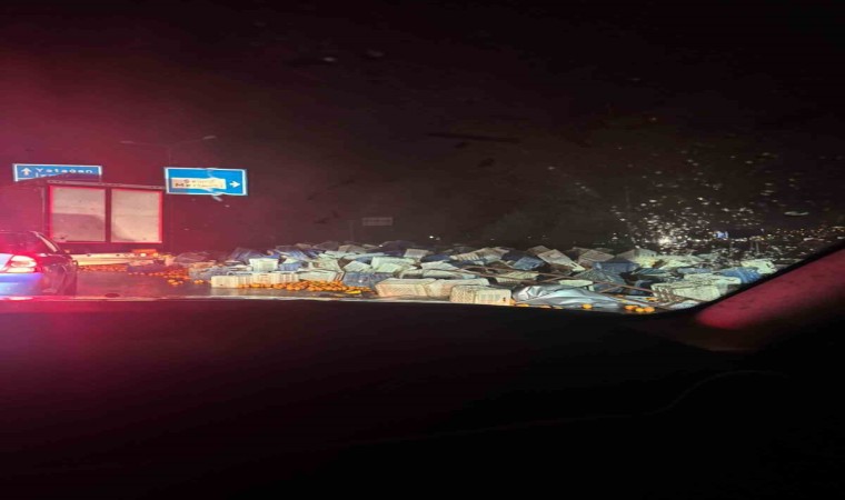 Muğla’nın Menteşe ilçesindeki bölge kavşağından sert dönüş yapan tırın yan kapağı ağırlığa dayanamayınca tonlarca narenciye yola savruldu.