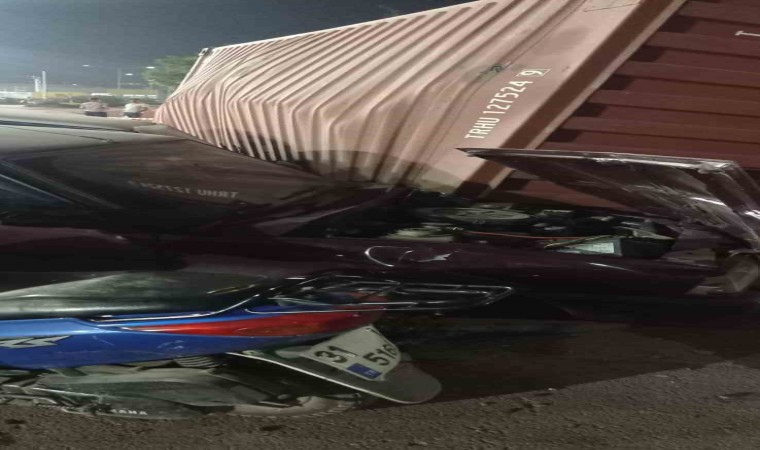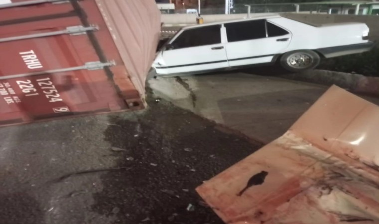 Hatay’ın İskenderun ilçesinde tırdan düşen yük konteyneri park halindeki 3 araca zarar verdi.
