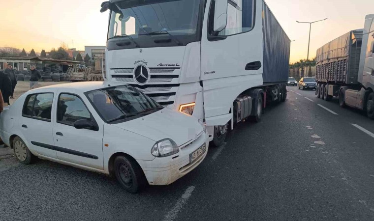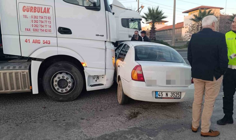 Manisa’nın Turgutlu ilçesinde meydana gelen kazada tır ile otomobil çarpıştı. Tırın altında yaklaşık 50 metre sürüklenen otomobilin sürücüsü kazayı yara almadan atlattı.