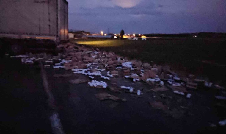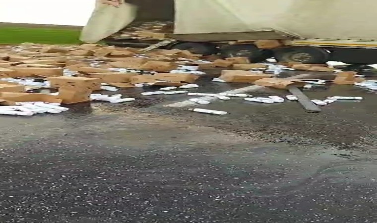 Bitlis’in Adilcevaz ilçesinde kozmetik yüklü tırın dorsesinin kayması sonucu içerisinde bulunan ürünler yola saçıldı.
