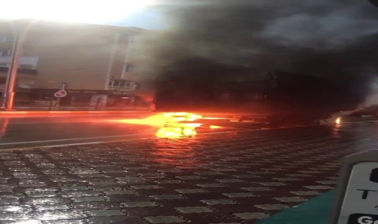 Tokat’tın Turhal ilçesinde sabah saatlerinde park halinde bulunan hayvan yemi yüklü tırın dorsesi alev aldı, o anlar cep telefonu kamerasına yansıdı.