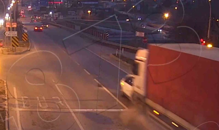 Polis ekipleri tarafından kaza ile ilgili inceleme başlatılırken, o anlar ise güvenlik kamerasına yansıdı. Görüntülerde tırın kırmızı ışık sebebiyle bekleyen hafif ticari araca çarptığı görülüyor. Tır çarptığı aracı metrelerce sürüklüyor. Hafif ticari araç bariyerlere çarparak durabiliyor.