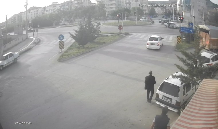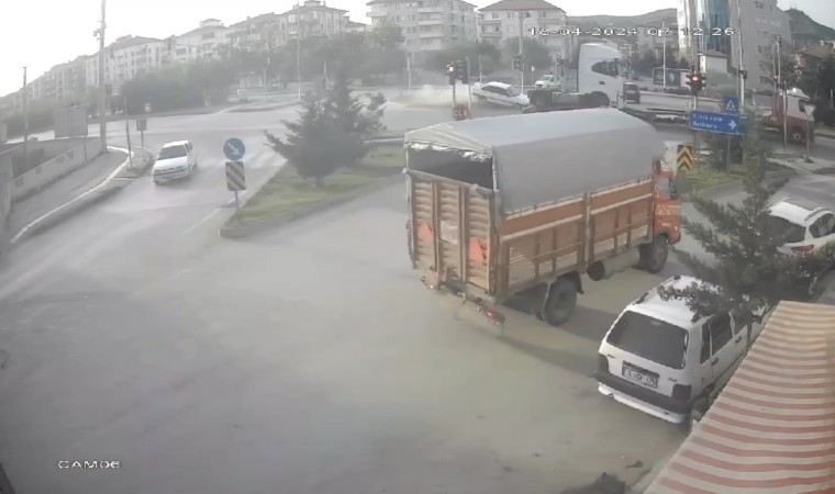 Kaza anı ise bir işyeri kamerası tarafından saniye saniye kaydedildi. Görüntülerde aynı istikamete seyir halinde olan tır ve otomobilin kavşağa birlikte giriş yaparak çarpıştığı görülüyor.