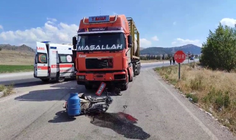 Afyonkarahisar’da tırla çarpışan motosiklet sürücüsü metrelerce savrularak ağır yaralandı.