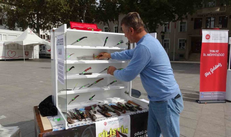Tokat’ta Sadullah Sezer isimli vatandaş 5 yıldır özenle oluşturduğu bıçak koleksiyonunu Diyanet Vakıfı tarafından düzenlenen panayırda satışa çıkardı. Yaklaşık 50 bin lira değerinde olan koleksiyonunu satışa çıkaran Sezer, elde edeceği tüm geliri Filistin’e bağışlayacağını açıkladı. Şu ana kadar 17 bin liralık satış yapan Sezer, bütün koleksiyonunu satmayı hedefliyor. Koleksiyonun da yöresel birçok bıçak bulunan Sezer, Filistin’e destek olmak için 5 yıldır özenle topladığı bıçaklarını kurduğu küçük tezgahında sergileyip satıyor satıyor.