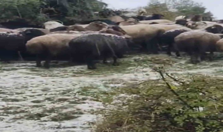 Tokat’taki Kızkayası Yaylası’nda aniden başlayan dolu yağışı çevreyi beyaza bürürken, hayvanlarını otlatan çoban zor anlar yaşadı.