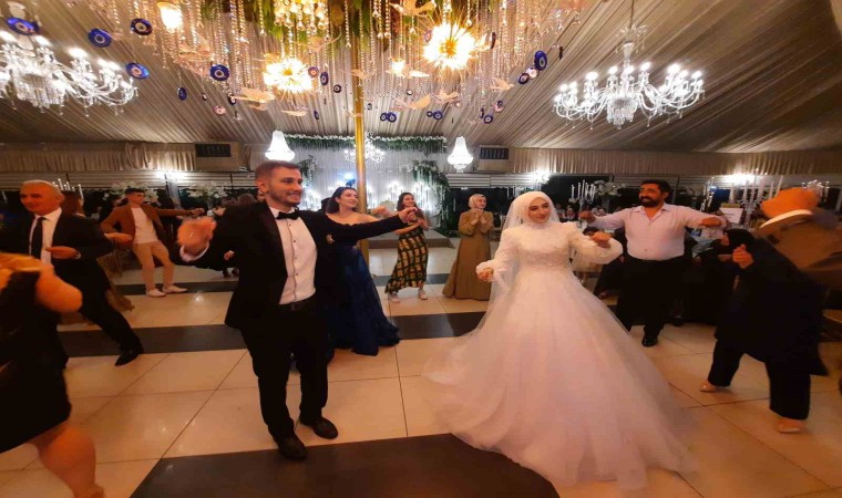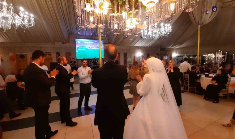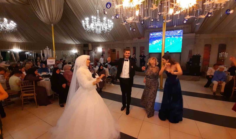Tokat’ta dünya evine giren Elif (27) ve Mert Üner (29) çifti, A Milli Futbol Takımı’nın heyecanına ortak oldu. Saat 22.00’de başlayan maç nedeniyle düğüne mola veren çift ve davetliler, salona kurulan ekranda A Milli Futbol Takımı’nın Hollanda ile oynadığı karşılaşmaya odaklandı. 20.00’da salona çıkarak davetliler ile oyun havası oynayan çift, maçın başlamasıyla karşılaşmayı izledi.
