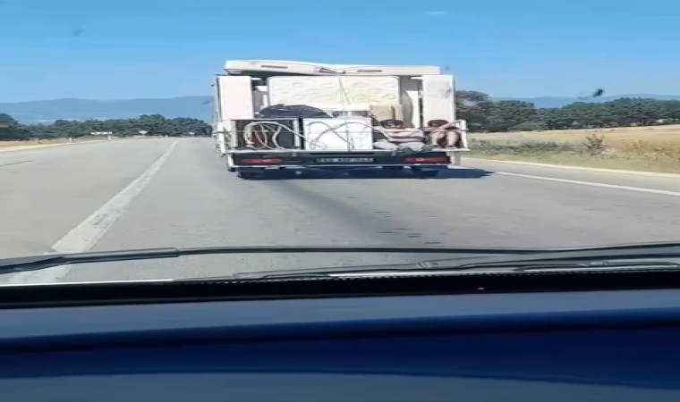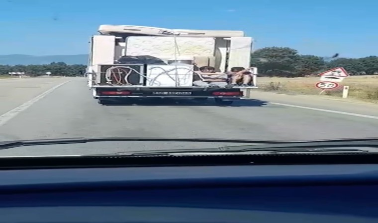 Tokat-Niksar karayolunda iki kişinin eşya yüklü kamyonetin arkasında yaptığı yolculuk, trafikte korku dolu anlara sebep oldu. O anlar çevredeki diğer sürücüler tarafından kaydedildi.