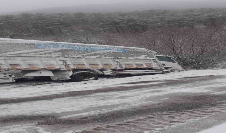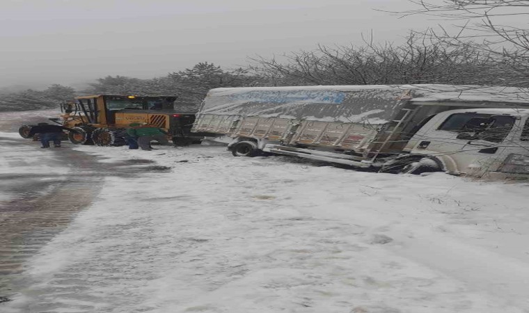 Tokat’ın Reşadiye ilçesinin yüksek kesimlerinde kar yağışı etkisini artırırken, bir kamyon yoldan çıkarak yan yattı.