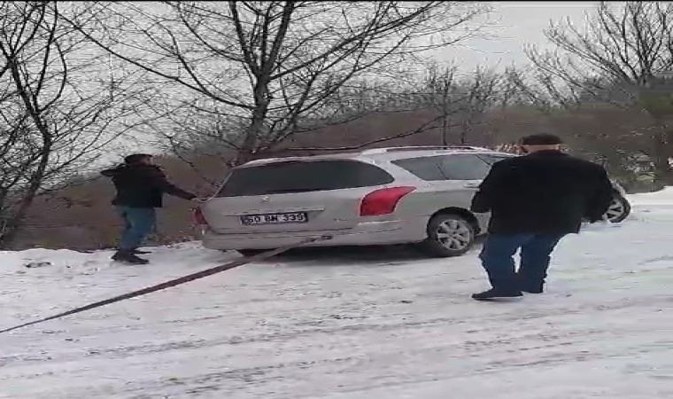 Tokat’ın yüksek kesimlerinde etkili olan kar yağışı ve soğuk hava nedeniyle bazı sürücüler zor anlar yaşadı. Almus-Niksar yolu Kızıldere mevkiinde etkili olan kar yağışı nedeniyle bir tır yolda kaldı. Aynı yolda bir otomobil de buzlanan yol nedeniyle kaydı. Uçuruma doğru kayan araç, yol kenarında bulunan armut ağacına çarparak durdu. Uçuruma düşmekten ağaç sayesinde kurtulan aracı ve tırı, yoldan geçen diğer vatandaşlar halat yardımıyla kurtardı. Yoldan geçen Ali Pektaş o anları cep telefonu kamerası ile kayda aldı. Görüntüde Pektaş’ın tır sürücüsüne “Tır yolda kaldı, abim üzgün” dese de şoförün gülerek verdiği yanıt videoyu izleyenleri güldürdü.